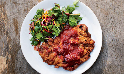 Serve chicken-fried steak with Watermelon–Ancho Chile Salsa and Hominy and Greens Salad with Citrus-Cumin Dressing.