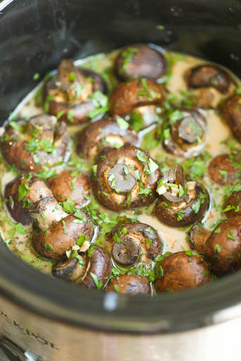 Place mushrooms, garlic, basil, oregano, thyme and bay leaves into a 3-qt slow cooker. Stir in vegetable broth; season with salt and pepper, to taste.