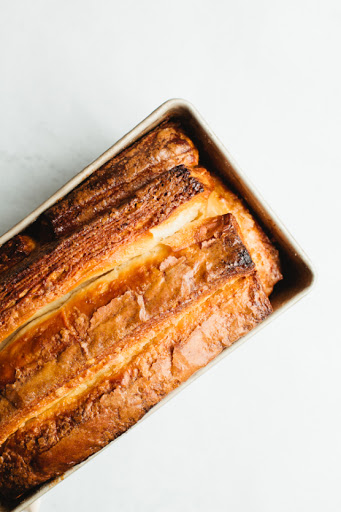 Using the scraps from the croissant dough or just cut strips of the dough, lay a few strips in the bottom of a buttered loaf pan. Sprinkle the layer with a bit of sugar and cinnamon. Continue the layering until the pan is 2/3 full.