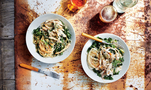- 1/2 bunch Tuscan kale, tough stems removed, leaves very thinly sliced (about 3 cups)