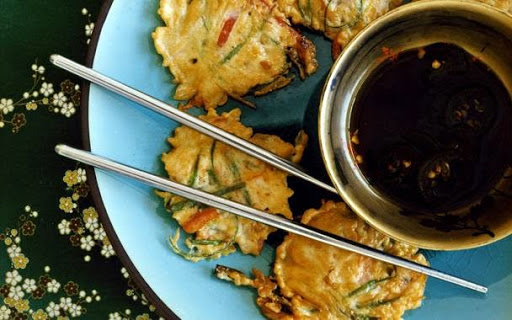 Stir batter, then cook pancakes in batches of 4 (2 Tbsp each, with some vegetables and 1 or 2 pieces shrimp), pressing down lightly with a large spatula to flatten and evenly distribute vegetables, turning once, until golden and cooked through, 3 to 5 minutes per batch.