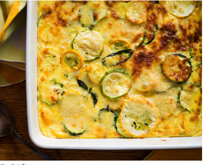 Butter a 2-quart low-sided baking dish, and arrange blanched zucchini over bottom. Scatter cheese over zucchini, then pour in custard.