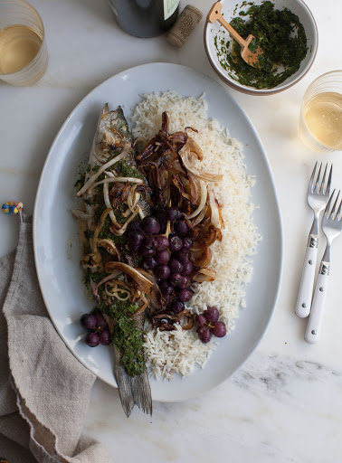 To serve, place the basmati on a large serving plate. Arrange the fish on the plate and spoon and spread the charred salsa verde onto the fish. Top with the fennel and grape mixture. Serve immediately.