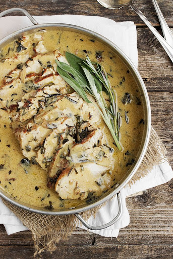 Pork loin (or tenderloins) cooked on the stove-top with wine and herbs, then sliced and served with a delicious, lightly creamy gravy. If using a pork loin roast, look for one with a little bit of fat. For pork tenderloins, be sure to trim the silverskin before cooking