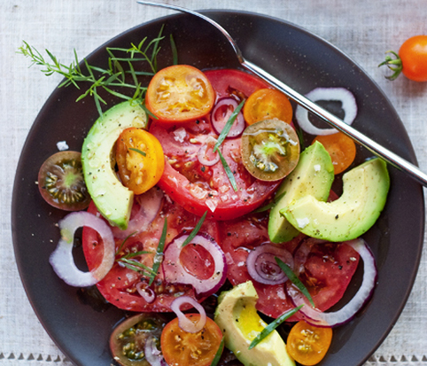 Assemble tomatoes, avocado and sliced onion on a small plate, sprinkle with tarragon leaves and dress with the olive oil and vinegar. Add sea salt and some pepper to taste