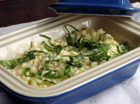 Remove corn from the cob. Melt margarine over medium heat. Add corn to margarine and cook until it is getting tender. Add sour cream and whipping cream. Stir and continue cooking until corn is tender. Stir in parmesan cheese, salt and pepper. Remove from heat and sprinkle top with basil.