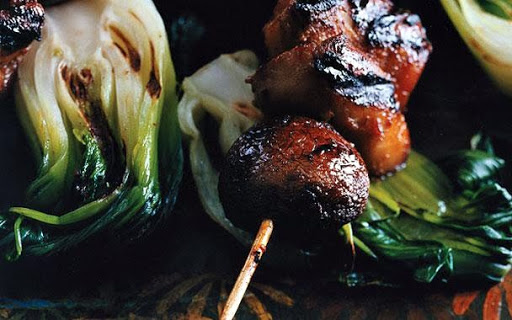 Chicken-and-mushroom skewers can be broiled in batches in a lightly oiled broiler pan 4 to 6 inches from heat, turning and basting occasionally, about 12 minutes total. Broil bok choy skewers, cut sides up, without turning, until charred in spots, about 2 minutes.