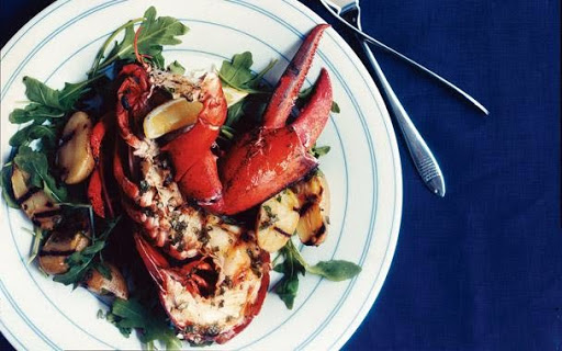 Arrange arugula on a large platter and top with grilled lobster and potatoes.