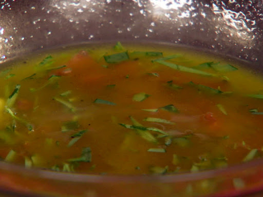Strain the mixture through a fine sieve and discard the solids. Stir in the remaining tomatoes and tarragon. Serve over slices of fresh tomato.