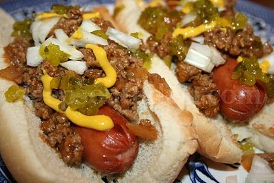 A skillet chili, made for hot dogs and with a Cajun-flair, made with ground beef, seasoned with Worcestershire, yellow mustard, onion, hot sauce, Cajun and other herbs and seasonings.