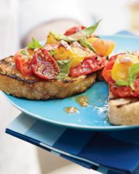 Light a grill or preheat a grill pan. Grill the ciabatta until toasted and charred in spots, about 1 minute per side. Transfer to plates and rub with the garlic halves. Spoon the tomatoes and their juices over the grilled bread and drizzle with olive oil. Sprinkle with salt and basil and serve.