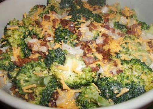 In large mixing bowl combine bacon,cheese, broccoli,and onion. Pour first mixture over second and stir until coated. Refrigerate. This gets better the longer it sits.
