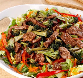 Sprinkle the steak with CHICAGO STEAK SEASONING and cut into thin slices. Add olive oil to a wok or large covered saucepan. Heat on high; when very hot add the steak and cook for 3 minutes until browned, stirring regularly. Add the broccoli and 2 tablespoons of the prepared dressing to the pan, and lightly cook the broccoli 2 to 3 minutes. Top the greens with the prepared beef and broccoli. Add additional dressing to taste.