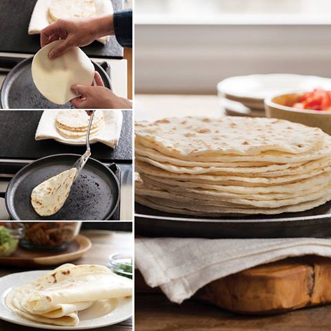 Heat a 10- or 12-inch cast-iron skillet over medium-high heat. Divide the dough into five pieces. Begin with one piece of dough, and cover the rest with a moist tea towel to prevent them from drying out. On a lightly floured surface, with a rolling pin, roll out the first piece of dough until it is 1/8 inch thick. Cut out as many rounds as you can (should be three or four) with a 6- or 8-inch metal cake cutter. Stack the raw tortillas on top of one another, dusting lightly with flour between them, if necessary, to prevent them from sticking. Gather the scraps and set them aside. Repeat with the remaining pieces of dough, including gathering and rerolling all of the scraps together.