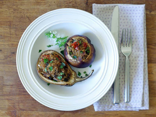 These little stuffed eggplants are quite filling and full of nutritional value. Eggplant has a particular spongy texture when uncooked, but quickly absorbs what you cook it with. In this case, lots of herbs and sweet cherry tomatoes. For a quicker meal, skip the halving and scooping and dice up the whole eggplant. Saute everything as noted below and serve.