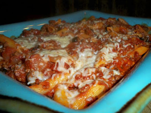 Cut sausage into bite size pieces and fry up along with the ground beef. Cook mostaccioli according to the package. Mix sausage, mostaccioli, Prego and 1 Cup of cheese. Put in a 9x13 pan bake @ 350* for 30-40 minutes covered with foil. Take out of oven remove foil and sprinkle with the remaining cheese and put back in oven for additional 5 minutes.