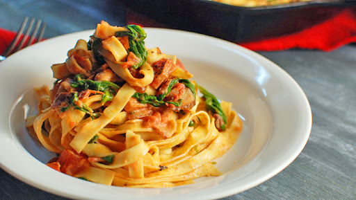 The water should be boiling at this point, so make sure it is salted well and drop your pasta in. Cook the pasta for only about 3 minutes. Strain the pasta and add it directly to the skillet. Stir and cook for 2 minutes before serving.