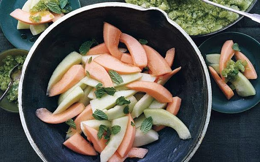 - This cool combination of musky cantaloupe and honeydew gets an unexpected zip from icy granita. Don't worry if the granita melts -it will slump into a lovely sauce over the fruit.