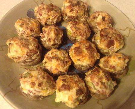 Clean and take the stems out of the mushrooms. Combine remaining ingredients and place a small amount in each mushroom cap. Bake at 350 for about 20-25 minutes