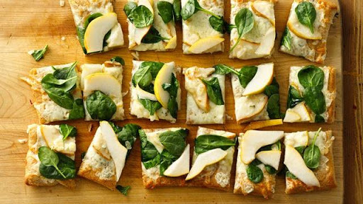 5 Bake 8 to 10 minutes longer or until crust is golden brown and cheese is melted. Top with spinach and reserved 1/2 cup pear slices. To serve, cut into 6 rows by 3 rows.