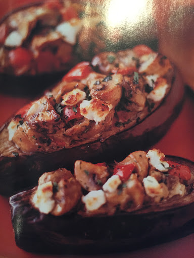 5. Spoon the stuffing into the eggplant, mounding it slightly. Pour the stock into the pan and cover with aluminum foil. Bake until the eggplant shells are tender, about 30 minutes. Serve hot or warm
