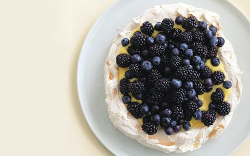 Spoon lemon curd into meringue and mound berries on top. Serve remaining whipped cream on the side.