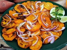 Arrange the sweet potato slices on a platter, and drizzle the remaining 1 /4 cup olive oil and the lime juice over them. Sprinkle with the cilantro and red onion, and serve.