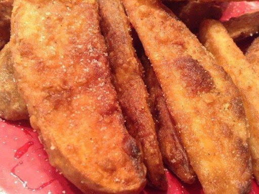 Mix the dry ingredients into a large bowl. Put some potatoes in the milk and egg then into the flour mixture till well coated.