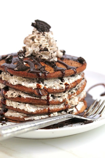 These Oreo pancakes are so incredible, and just the mark I want to leave as I walk into another year. They are fluffy with cookies and cream bits sprinkled throughout and a hint of cocoa powder which isn’t too overwhelming in chocolate flavor. This makes this pancake the perfect vehicle for sandwiching with Oreo whipped cream and chocolate sauce!