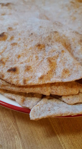 Mix dry ingredients. Add 3/4 c hot water. Mix. If too dry, add more hot water, tablespoon at a time. Cover and rest for 20 minutes. Divided into 8 equal balls. Cover and let rest 20 minutes. Roll out into circle, very thin, dusting counter with more flour. Cook in hot skillet for about a minute per side.