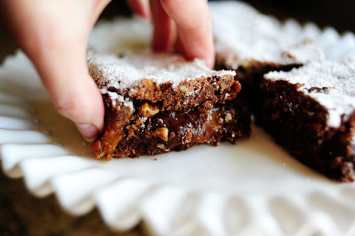 Bake for 20 to 25 minutes. Remove from pan and allow to cool to room temperature, then cover and refrigerate for several hours. When ready to serve, generously sift powdered sugar over the surface of the brownies. Cut into either nine or twelve helpings, and carefully remove from the pan.