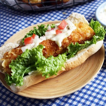Layer 1 lettuce leaf and 1 fish fillet in each hot dog bun. Top each evenly with the tartar sauce, tomato and onion.
