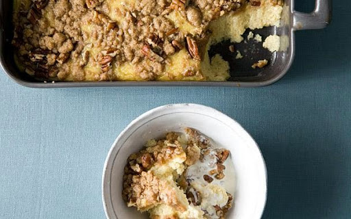 • Topped with a brown sugar and pecan streusel, this pudding has a delightfully nubby texture from quick-cooking grits and a deep, dark sweetness from maple syrup.