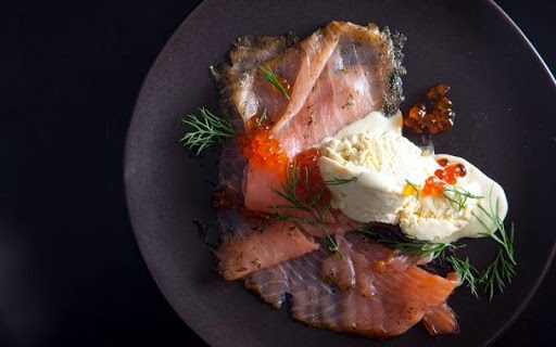 Top gravlaks with small scoops of ice cream and spoon a small amount of roe beside ice cream.