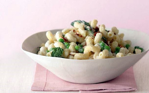 • This pasta is finished in a fast garlicky almond sauce, studded with peas, and topped with chopped roasted almonds.