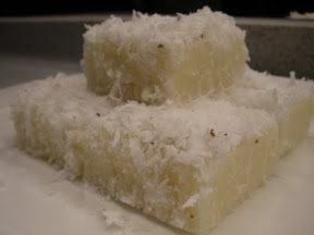 6. Pour in the coconut topping, again use the kueh lapis presser to press the coconut firmly on the tapioca cake. To serve immediately or keep refrigerated to serve cool.