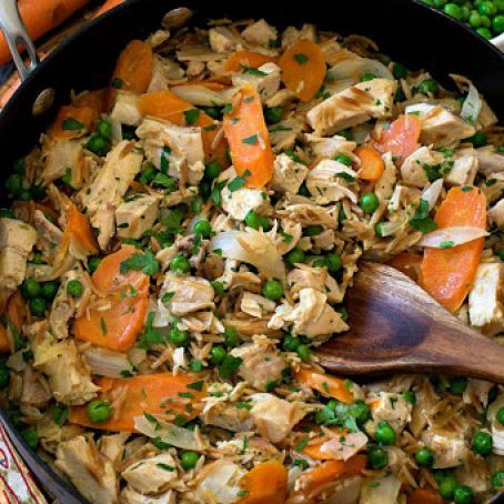 In a large dry skillet pan over medium high cook orzo until lightly browned; about 3 minutes stirring frequently.