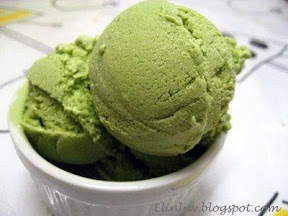 When the mixture is thickened, remove the pan from the heat. Soak the bottom of the pan in ice water and cool the mixture. Add green tea in the egg mixture and mix well, cooling in ice water. Add whipped heavy cream in the mixture and stir gently. Pour the mixture in an ice cream maker and freeze, following instructions of the ice cream maker. Or, pour the mixture in a container and freeze, stirring the ice cream a few times if not using an ice cream maker.