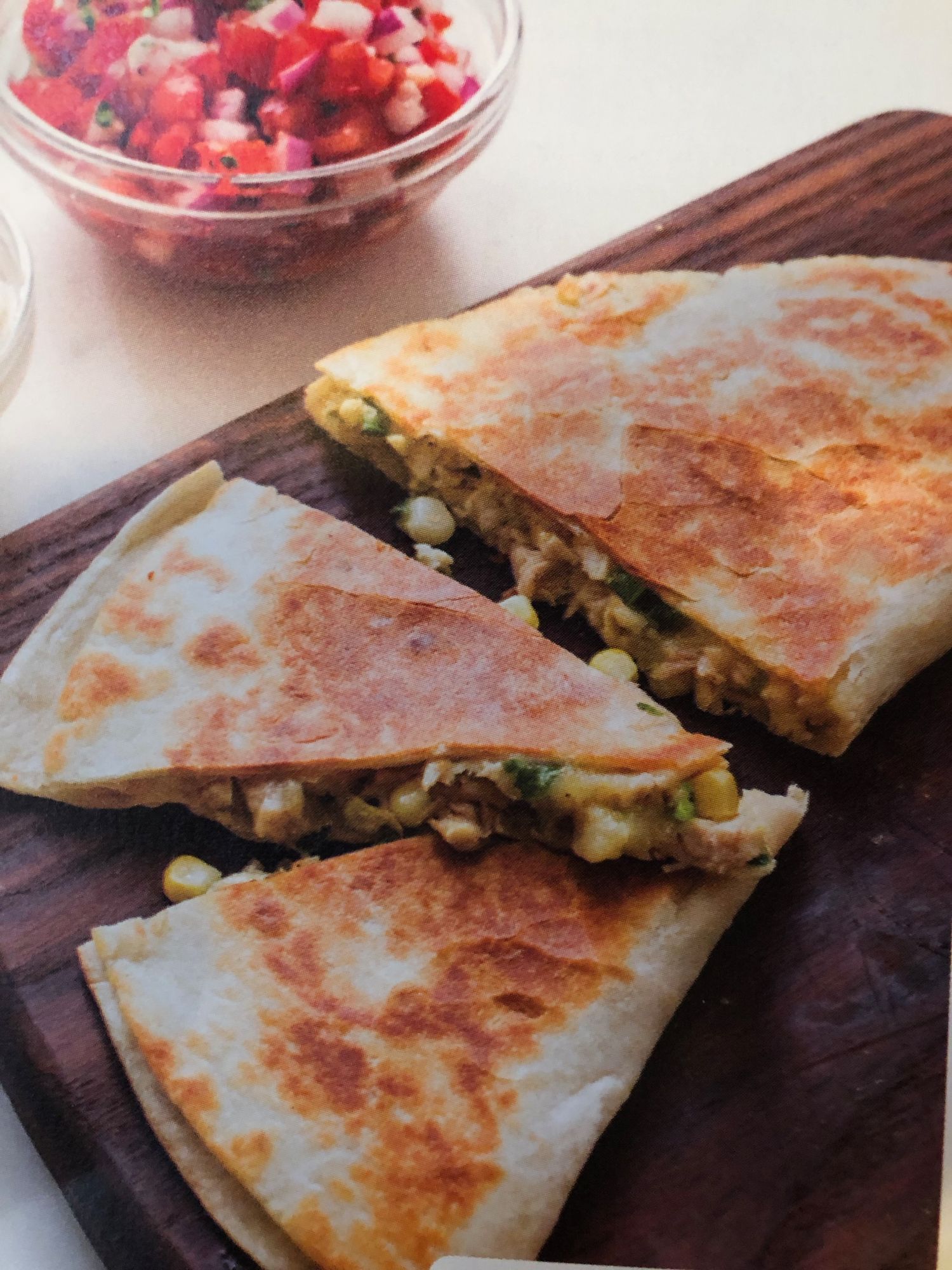 Combine chicken, cheese, jalapeños, corn, scallions and pepper in bowl. Spread 1 heaping cup chicken mixture over half of each tortilla, leaving 1/2 inch border at edge. Fold tortillas over filling, pressing firmly to seal. Heat 2 tbs spoon oil in nonstick skillet over medium heat until shimmering. Place 2 quesadillas in skillet, weigh down with large saucepan, and cook until browned and cheese has melted, about 2 minutes per side.