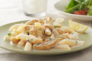 DRAIN pasta, reserving 1/2 cup of the cooking water. Mix reserved water with cream cheese and bouillon until well blended. Add to chicken with lemon zest; mix well. Cover; cook on low heat 5 min. or until chicken is done. Stir in pasta, lemon juice and parsley; cook; uncovered, 1 min. or until heated through, stirring frequently. Stir in cheese.