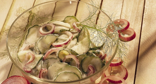 In medium bowl, mix everything except the cucumbers until well blended. Stir in the cucumbers and mix again.