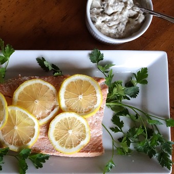 Serve the salmon immediately or chilled, garnished with the sauce and lemon slices.