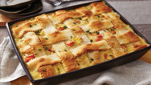 Unroll dough on cutting board; cut into strips with fluted pastry wheel or pizza cutter. Arrange strips in lattice design over turkey mixture. Brush dough with melted butter.