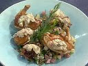 To serve, place equal amounts of the vegetable mixture in the center of 4 large plates and top with the chicken. Spoon the Bearnaise Sauce over the chicken and serve immediately.