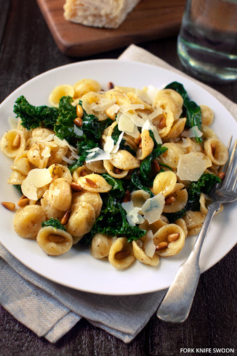 Orecchiette with Wilted Spinach, Kale and Toasted Pine Nuts
