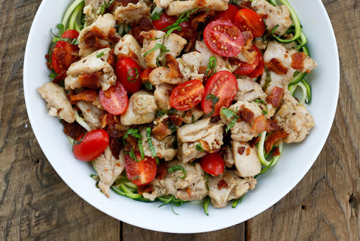 Serve the zucchini noodles, pasta, or rice topped with the chicken and sauce. Sprinkle each serving with the cooked and crumbled bacon. Enjoy!