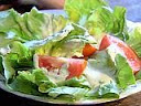 Cut each head of lettuce into quarters, remove some of the cores, and arrange on 6 salad plates. Cut the tomatoes into wedges and add to the plates. Pour on the dressing and serve.