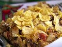 Place 4 soaked tortillas in the bottom of prepared baking dish, tearing to fit. Layer half of turkey mixture and half of cheese. Repeat layers. Top with crushed tortilla chips. Place in oven and bake for 30 minutes.