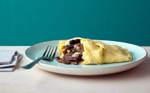 Before eggs are completely set, add mushroom mixture and cheese to one half, on side away from handle.