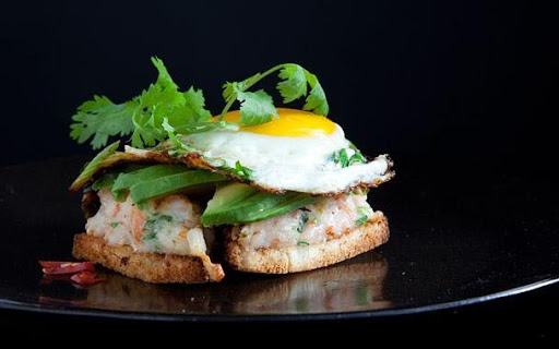 • AVOCADO AND CHILE-SPICED FRIED EGGS ON SHRIMP TOAST